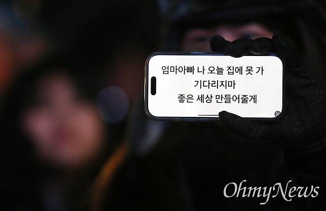 | ▲ 2024년 12월 7일 오후 서울 영등포구 국회 앞에서 열린 '내란죄 윤석열 퇴진! 국민주권 실현! 사회대개혁 범국민촛불대행진'에 참석한 한 시민이 "엄마아빠 나 오늘 집에 못가, 좋은 세상 만들어줄게"라는 문구를 보여주며 탄핵투표에 참여하지 않고 본희의장을 떠난 국민의힘 의원들에게 투표참여를 촉구하고 있다. |