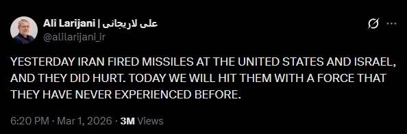 | ▲ 라리자니 사무총장은 X(옛 트위터)에 "어제 이란은 미국과 이스라엘을 향해 미사일을 발사했고, 그 공격은 상당한 타격을 입혔다. 오늘 우리는 그들이 이전에는 경험해 보지 못한 위력으로 그들을 공격할 것"이라며 미국과 이스라엘을 향한 공격을 지속하겠다고 천명했다. |