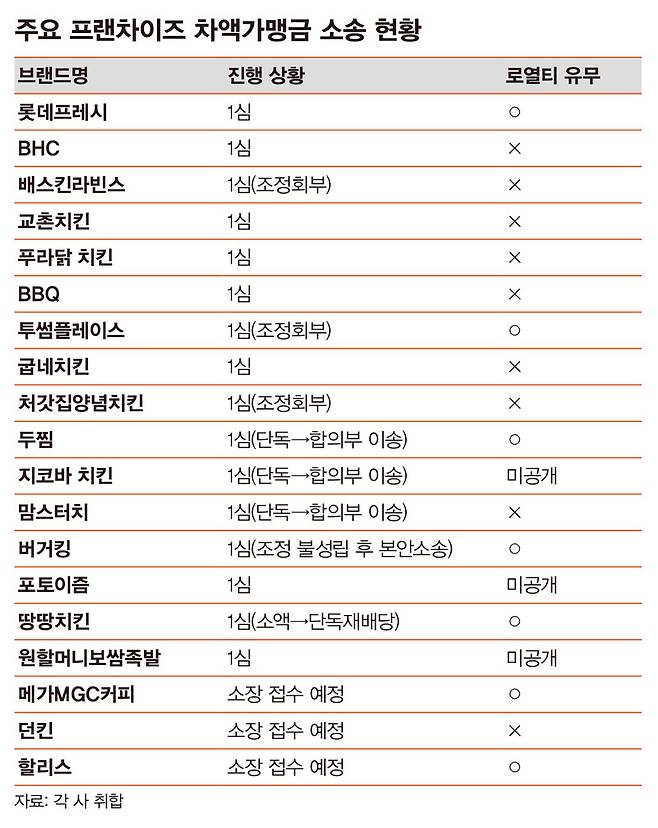 업계에 따르면 현재 치킨·커피·버거 등 외식 브랜드를 중심으로 제기(예정 포함)된 차액가맹금 소송만 20여 건에 이른다. 법무법인 와이케이(YK)가 가맹점주 쪽을 상당수 대리하고 있고, 태평양·화우·광장·세종·김앤장 등 대형 로펌이 가맹본부를 대리해 참전했다. 소송에 참여한 가맹점주는 브랜드별로 수십 명에서 많게는 수백 명에 이르는데, 배스킨라빈스의 경우 417명이 참여했다. 대부분의 소송은 1심이 진행 중이고 투썸플레이스, 비비큐(BBQ), 비에이치씨(BHC), 두찜, 버거킹 사건 등의 변론·조정 기일이 3월에 예정돼 있다.