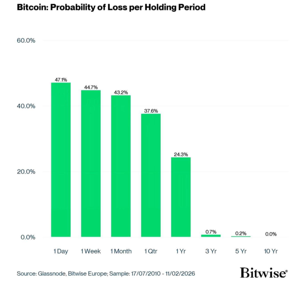 1일(현지시간) 비트와이즈 유럽 연구에 따르면 2010년 중반부터 2026년 초까지 비트코인 가격 흐름을 분석한 결과 보유 기간이 길어질수록 손실 확률이 급격히 낮아지는 패턴이 확인됐다.