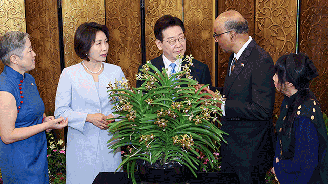 이 대통령과 김혜경 여사는 오늘(2일) 오전 타르만 샨무가라트남 싱가포르 대통령 부부가 참석한 가운데 공식환영식에 이어 난초명명식에 참석했습니다.