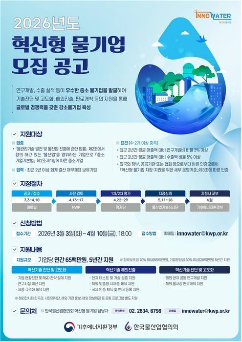 기후에너지환경부는 3일부터 내달 10일까지 공모를 통해 제7기 혁신형 물기업 10곳을 지정해 국내 물분야 중소기업이 세계적 경쟁력을 갖춘 기업으로 성장할 수 있도록 집중 지원에 나선다고 밝혔다.