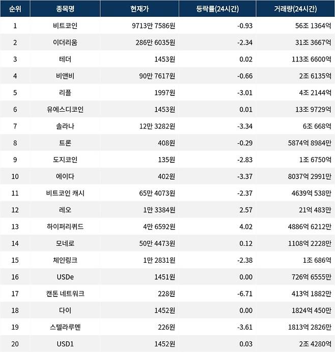 비트코인은 현재 9713만 7586원에 거래되고 있으며 시가총액은 1942조 4302억원을 기록하고 있다.