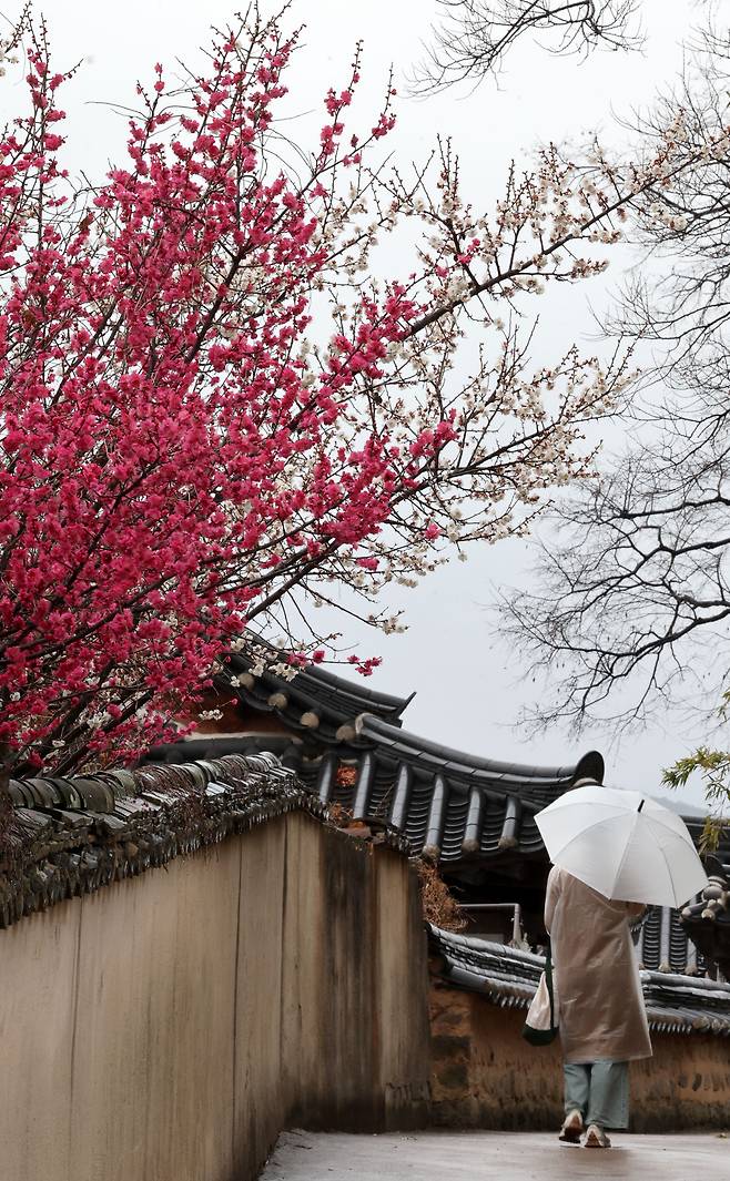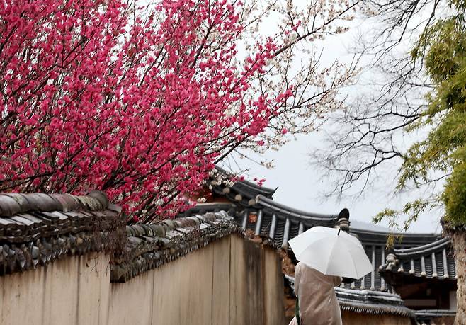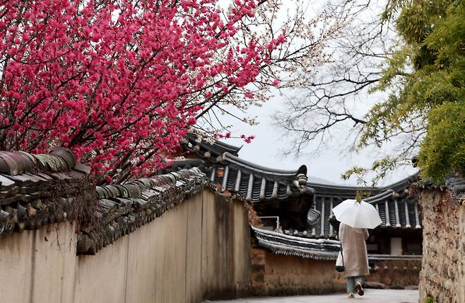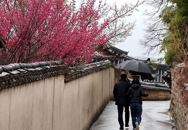개구리가 겨울잠에서 깨어난다는 경칩을 사흘 앞두고 봄비가 내린 2일 오후 경주를 찾은 관광객이 교촌한옥마을 골목길을 산책하고 있다. /이용선기자 photokid@kbmaeil.com