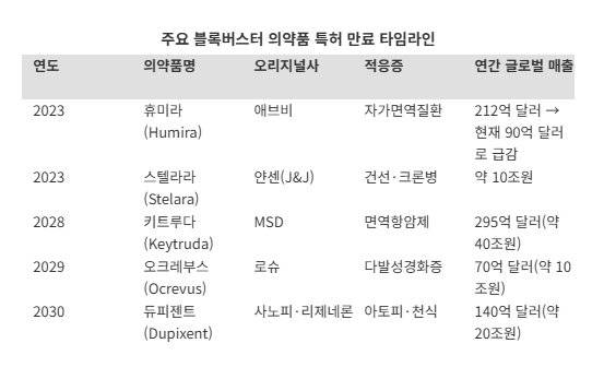 셀트리온과 삼성바이오에피스를 필두로 한 K바이오가 미국 현지 생산 기반을 확보하며 관세 리스크를 정면 돌파하는 한편, 2030년까지 200여개 의약품 특허 만료로 최대 600조원 규모의 '특허절벽 시장'이 열릴 것으로 예고돼 있어 성장 기대감은 어느 때보다 높다.
