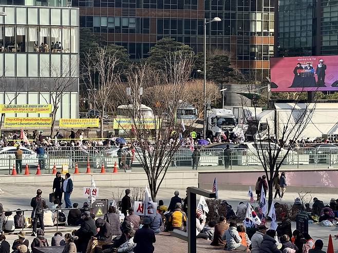 그런데 최근, 반민주적 내란을 옹호하거나 부정선거 음모론을 제기하는 집회가 광화문 일대를 물들이고 있습니다. 무분별한 의혹 제기가 빗발치고 대안은 '윤 어게인'으로 수렴되는 듯합니다. 2월 28일, 공연을 보기 위해 찾은 세종문화회관에서 바라본 보수 진영의 집회에서도 마찬가지였습니다.