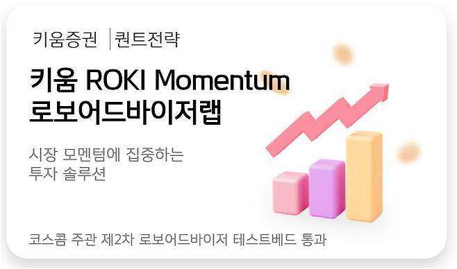 '키움 ROKI Momentum 로보어드바이저 랩'은 금융위원회와 코스콤이 주관하는 제2차 로보어드바이저(RA) 테스트베드 운용 심사를 통과했다. 이 랩 상품은 모멘텀 전략을 기반으로 한 알고리즘을 활용해 시장 추세에 따라 채권과 주식 등의 비중을 조절하고 있으며, 이 상품의 핵심은 시장의 자금 혹은 관심이 집중되는 종목을 데이터로 판별하고 상승 탄력이 붙은 종목에 투자를 해 승률을 높이는 전략을 취하고 있어 'K'자형 환경에 적합한 상품으로 꼽힌다.