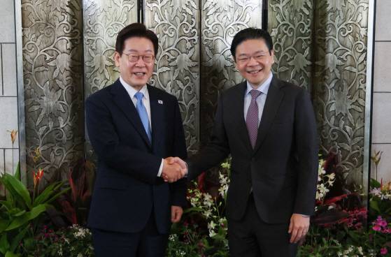 [이재명 대통령과 로런스 웡 싱가포르 총리가 2일 싱가포르 외교부 청사에서 정상회담에 앞서 악수하고 있다. (싱가포르=연합뉴스)]