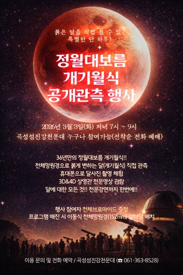 곡성군 관계자는 "정월대보름과 개기월식이 겹치는 특별한 날, 지역주민과 관광객이 함께 밤하늘의 감동을 나누는 올해 가장 특별한 시간이 되길 바란다"고 전했다.