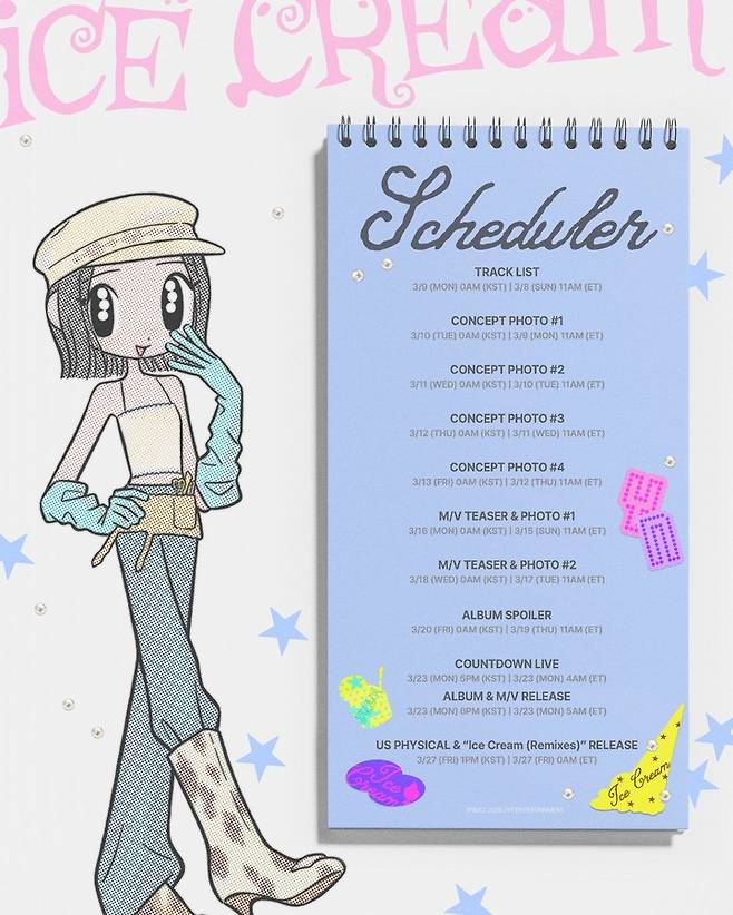 앨범 발매 당일인 23일 오후 5시에는 카운트다운 라이브를 통해 팬들과 직접 소통하며 데뷔의 기쁨을 나눈다. 이어 오후 6시 타이틀곡과 수록곡이 정식 발매되며, 27일에는 US 피지컬 앨범과 'Ice Cream'의 리믹스 버전이 추가로 릴리스되어 글로벌 시장 공략에도 박차를 가할 전망이다.