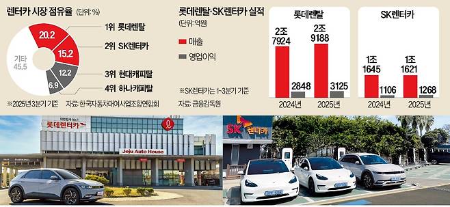 렌터카 시장 점유율(지난해 3분기 말 렌터카 수 기준)은 롯데렌탈이 20.2%, SK렌터카가 15.2%다. 격차가 5%포인트에 불과하지만 매출과 영업이익 규모는 롯데렌탈이 SK렌터카보다 두 배 가까이 크다. 렌터카업계 관계자는 “장·단기 렌터카 시장에서 모두 롯데렌탈이 앞서고, 롯데렌탈은 차량 리스와 할부금융 사업도 하고 있다는 게 SK렌터카와의 차별점”이라고 말했다.