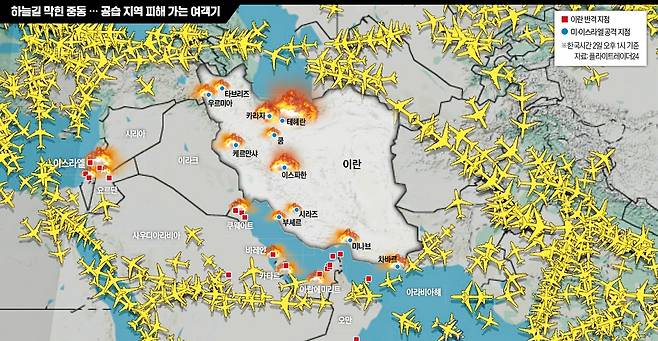 중동 하늘길은 완전히 막혔다. 바레인, 이라크, 요르단, 쿠웨이트, 카타르, UAE 등 대부분 중동 국가가 영공을 폐쇄했다. 항로 추적 사이트 플라이트레이더24에 따르면 이날 기준으로 중동 7개 공항에서 하루 새 3400편 넘는 항공편이 취소됐다. 영국 가디언은 걸프국 3대 항공사인 에미레이트항공, 카타르항공, 에티하드항공이 중동 공항에서 일반적으로 하루 약 9만 명의 승객을 태운다고 했다.