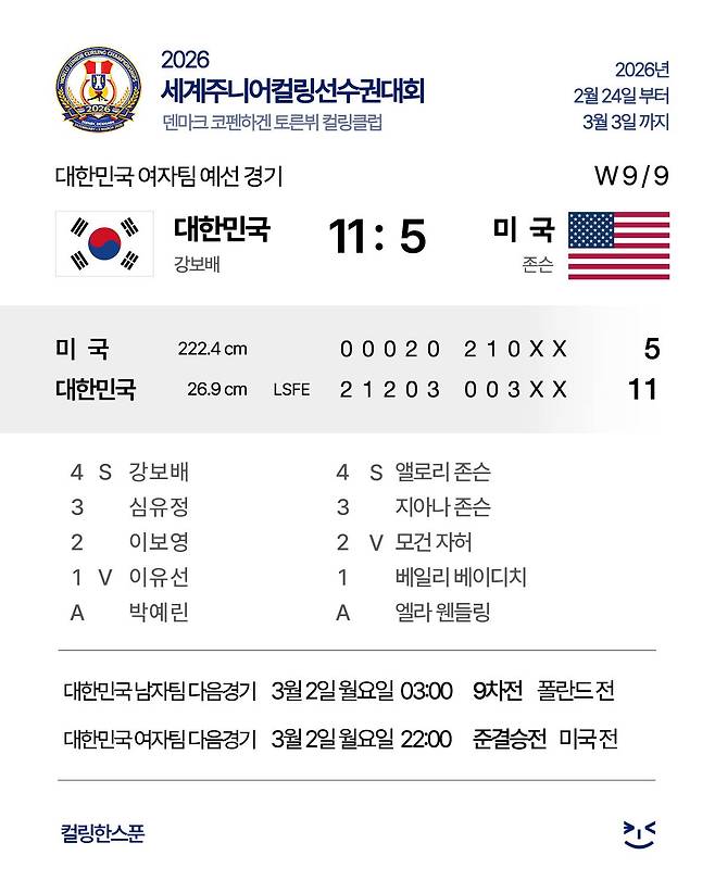 미국이 4엔드에 2점을 만회했으나, 한국은 곧바로 5엔드에 대거 3점을 뽑아내 전반전을 8-2로 여유 있게 마무리했다. 후반 들어 미국이 6엔드 2점, 7엔드 1점을 쫓아오며 반격을 시도했지만, 8엔드에 한국이 다시 3점을 쐐기 박으며 상대의 추격 의지를 완전히 꺾어버렸다.
