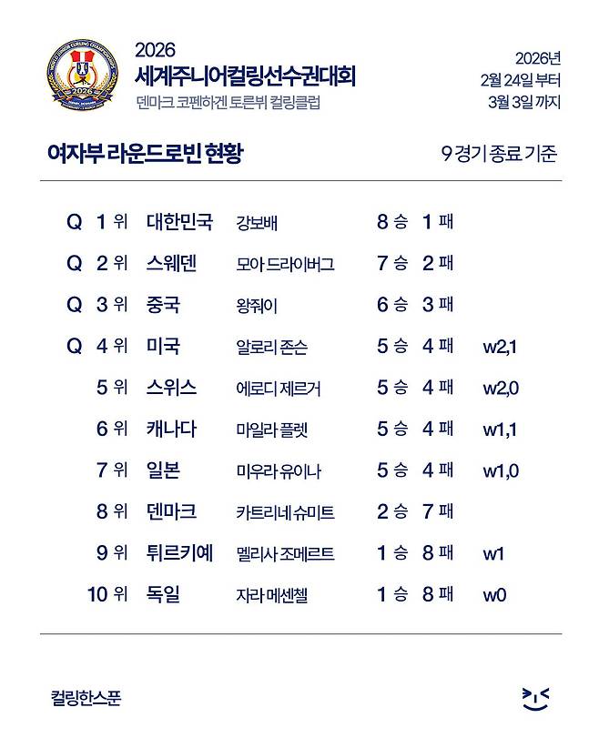 한국 대표팀은 1일(한국시간) 덴마크 코펜하겐 토른뷔 컬링클럽에서 열린 2026 세계주니어컬링선수권대회 여자부 예선 마지막 9차전에서 미국을 11-5로 가볍게 제압하며 전체 1위로 4강 진출을 확정 지었다.
