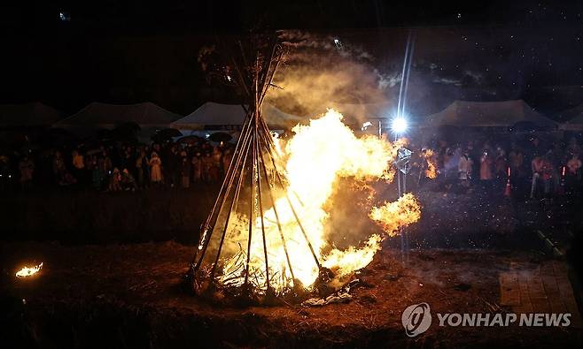 (서울=연합뉴스) 김인철 기자 = 정월대보름을 하루 앞둔 2일 서울 노원구 당현천 일대에서 열린 2026 병오년 정월대보름 한마당에서 시민들이 타오르는 달집을 바라보고 있다. 2026.3.2