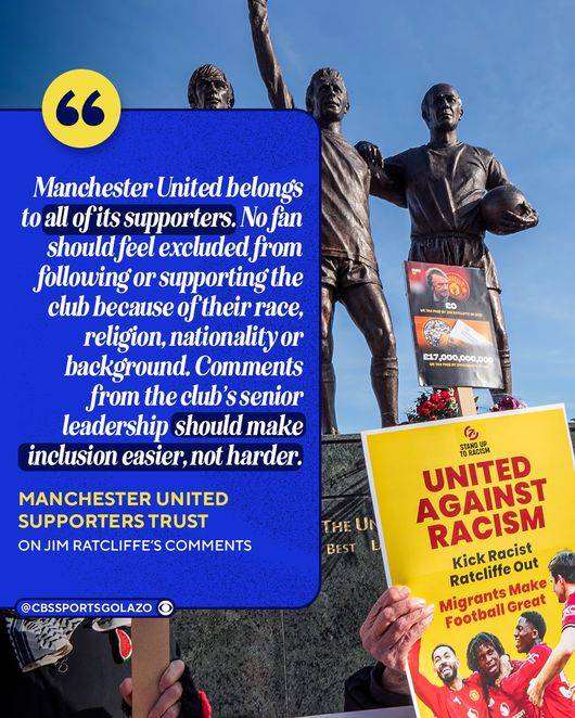 맨체스터 유나이티드 팬들이 공동 구단주인 짐 랫클리프 경의 '이민자 식민지화' 망언에 반대하는 퍼포먼스를 펼쳤다.