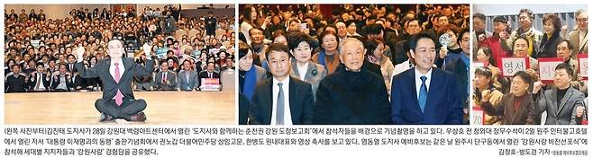 김진태 지사는 춘천에서 대규모 도정보고회를 개최, 현역 프리미엄을 활용한 세몰이에 나섰다. 김 지사는 지난달 28일 백령아트센터에서 열린 ‘도민과 함께하는 강원도정 보고회’ 춘천권 첫 행사를 열었다. 주최 측 추산 5000여 명이 대거 참석했다.