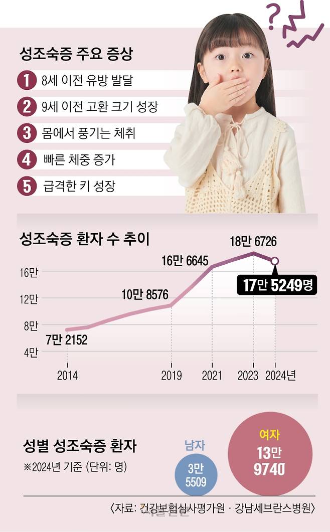 국내 성조숙증 환자는 매년 늘고 있다. 건강보험심사평가원에 따르면 2014년 7만 2152명이던 환자 수는 2024년 17만 5249명으로 10년 만에 10만명 넘게 늘었다. 또 2024년 기준 여아 환자가 13만 9740명으로 남아 환자 3만 5509명보다 4배 많았다.