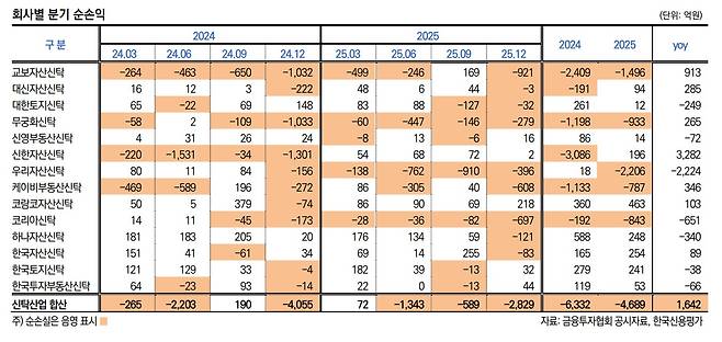 실적 악화의 직접적인 원인으로는 책임준공형 토지신탁 구조가 지목된다. 책임준공형은 사업 초기에는 보수를 선취해 수익을 확보할 수 있지만, 분양 부진이나 공사 지연이 발생할 경우 신탁사가 대위변제나 신탁계정대 투입을 통해 자금을 메워야 하는 구조다. 이 과정에서 투입된 자금은 자본을 직접 잠식하는 손실로 이어진다. 호황기에는 위험이 가려졌지만, 시장 침체가 장기화되면서 수익은 선반영되고 리스크는 후행하는 구조적 문제가 재무에 본격 반영됐다는 분석이다.