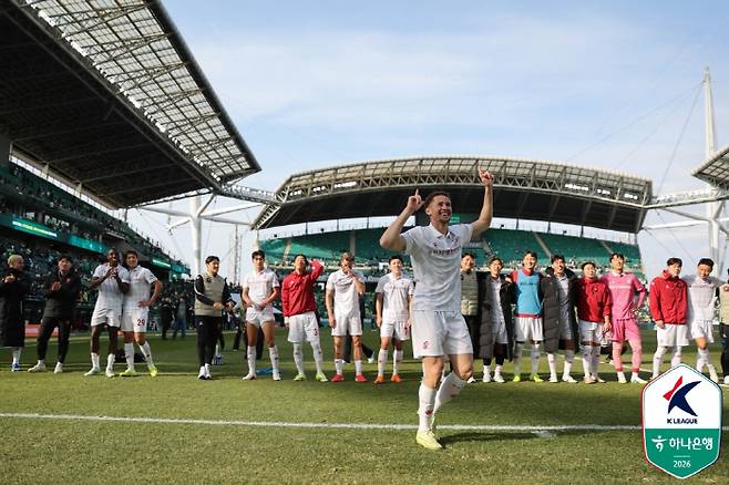 부천은 1일 전주월드컵경기장에서 열린 전북 현대와의 '하나은행 K리그1 2026' 1라운드에서 3대2 역전승을 거뒀다. 전반 12분 이동준에게 선제골을 내주며 불안한 출발을 했지만, 25분 갈레고가 상대 실수를 가로채 동점골을 뽑았다. 후반 8분 이동준에게 다시 한골을 내주며 또 다시 끌려갔지만, 37분 몬타뇨의 동점골과 추가시간 갈레고의 페널티킥을 묶어 대역전 드라마를 썼다.