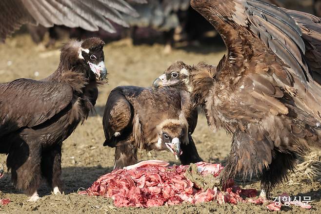 매번 같은 장면이 연출되는 것은 아니다. 날씨가 흐리거나 주변이 소란스러우면 독수리는 좀처럼 다가오지 않는다. 안전이 확보됐다고 판단할 때까지 기다린다. 길게는 사흘 동안 먹이를 앞에 두고도 경계를 늦추지 않는다. 야생의 본능이다.