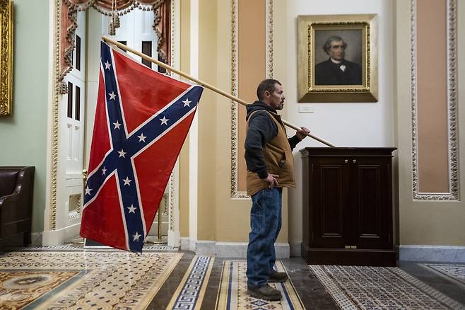 | ▲ 2020년 1월 6일 남부연합기를 들고 있는 도널드 트럼프 미국 대통령 지지자가 미국 워싱턴 D.C. 국회의사당에서 조 바이든 차기 대통령 인준을 반대하는 시위를 하던 중 상원회의장 밖에서 찍힌 모습. |