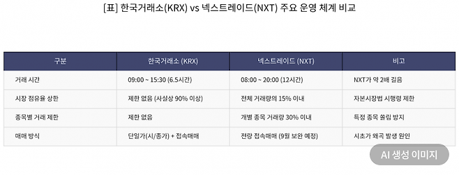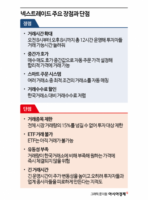 대체거래소 넥스트레이드(NXT)가 출범한 지 1년이 지나면서 거래 시간 확대와 수수료 절감, 거래소 경쟁 확대 등 당초 목적을 어느 정도 달성했다는 평가가 나온다. 하지만 주가 변동성의 급격한 확대와 가격 왜곡 등 다양한 문제점도 노출돼 이를 시급히 해결해야 한다는 지적도 커진다. 주식 거래 시간이 급격히 확대됨에 따른 투자자와 증권업 종사자의 피로도 증가 역시 해결해야 할 과제다.