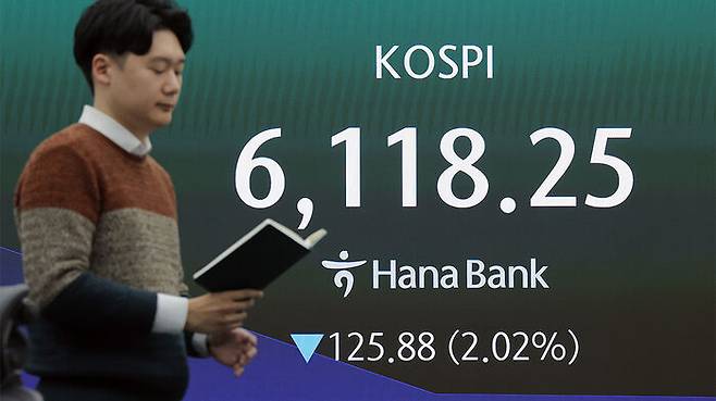 이날 오전 9시 2분 현재 코스피는 전장보다 151.84포인트(2.43%) 내린 6,092.29입니다.