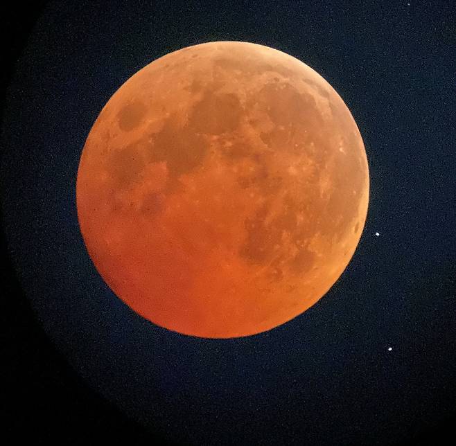| ▲ 블러드문과 항성 2022년 11월 8일 개기월식이 진행되는 동안 천체망원경의 접안렌즈에 스마트폰을 대고 촬영. |