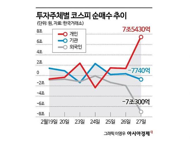최근 우리 증시에서 외국인의 매도세가 거세진 가운데 이른바 '동학개미'로 불리는 국내 개인투자자들이 지수를 받치는 형국이 지속된다. 한국거래소에 따르면 전거래일인 지난달 27일 외국인들은 코스피 시장에서 하루 기준 역대 최대 규모인 7조300억원을 순매도한 반면 개인투자자들은 7조5430원을 순매수해 지수를 방어했다. 외국인 투자자들은 이날까지 8거래일 연속 순매도를 이어가는 중이다.