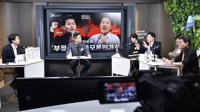 | ▲ 이준석 개혁신당 대표와 한국사 강사 출신 유튜버 전한길(본명 전유관), 김미영 VON 대표, 이영돈PD, 박주현 변호사가 27일 오후 서울 종로구 <펜앤마이크>에서 부정선거를 주제로 무제한 토론을 하고 있다. |