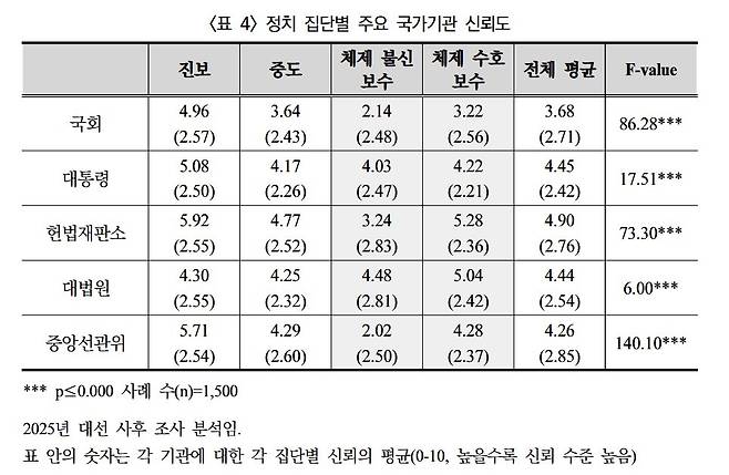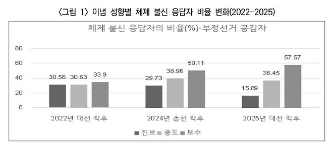 <현대정치연구> 제18권 제2호(2025.8)에 실린 성예진 성균관대 좋은민주주의연구센터 전임연구원의 논문 '2025년 체제불신, 체제수호 보수의 분화'는 2022년·2024년·2025년에 실시한 설문조사를 바탕으로 체제를 불신하는 대중의 비율이 진보나 중도층보다 보수층에서 최근 급격히 증가했음을 보여준다.