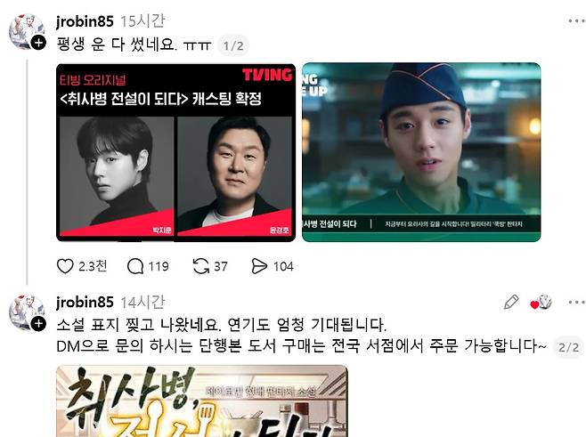 이런 상황에서 박지훈의 차기작 소식이 전해지자 원작자 반응이 뜨겁게 확산됐다. 2일 '취사병 전설이 되다' 원작자 제이로빈은 "평생 운 다 썼네요. ㅠㅠ"라는 글로 기쁨을 드러냈고, 이어 "소설 표지 찢고 나왔네요. 연기도 엄청 기대됩니다"라고 덧붙였다. 또 "DM으로 문의하시는 단행본 도서 구매는 전국 서점에서 주문 가능합니다"라며 관련 문의에 답하기도 했다.