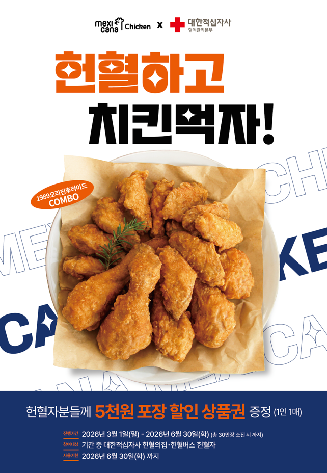 대한적십자사 혈액관리본부는 헌혈자 예우 강화와 헌혈문화 확산을 위해 멕시카나치킨과의 협력을 확대·추진한다고 3일 밝혔다.