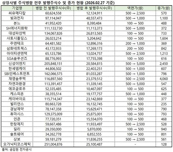 3일 금융감독원 전자공시시스템에 따르면 최근 한 달 사이 유가증권시장과 코스닥 시장에서 주식병합을 결정한 상장사는 2월 27일 종가(역순)를 기준으로 오가닉티코스메틱(128원), 빌리언스(235원), 주연테크(369원), SH에너지화학(372원), 케이바이오(377원) 등 총 27개사에 달한다. 올해 초로 범위를 넓히면 28개사로 늘어나며, 이는 단 한 곳의 주식병합 공시도 없었던 작년 같은 기간과 비교하면 매우 이례적인 현상이다.