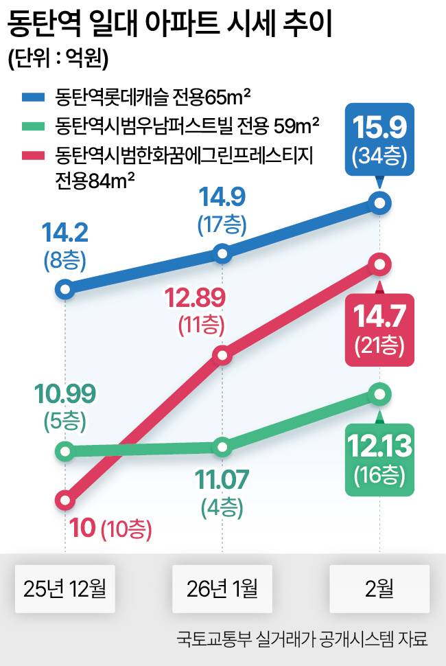3일 국토교통부 실거래가 공개시스템에 따르면 화성시 동탄구 오산동 ‘동탄역롯데캐슬’ 65㎡(이하 전용면적)는 지난 2월 11일 15억9000만원(34층)에 거래됐다. 토허구역 지정이 이뤄지기 전인 지난해 10월 1일 같은 면적이 12억8000만원(2층)에 손바뀜한 것과 비교하면 4개월 만에 3억원 이상 뛰었다.