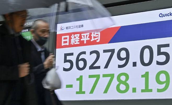 이날 도쿄 주식시장에서 닛케이지수는 전일 대비 3.06% 급락한 56,279로 마감했다.