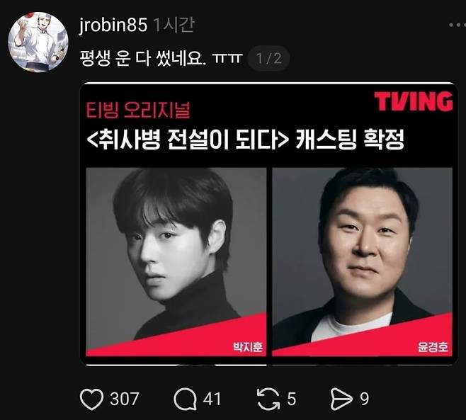 티빙 오리지널 시리즈 '취사병 전설이 되다'의 원작자 제이로빈은 지난 2일 소셜미디어를 통해 박지훈 캐스팅과 관련해 "평생 운 다 썼다"고 말했다.