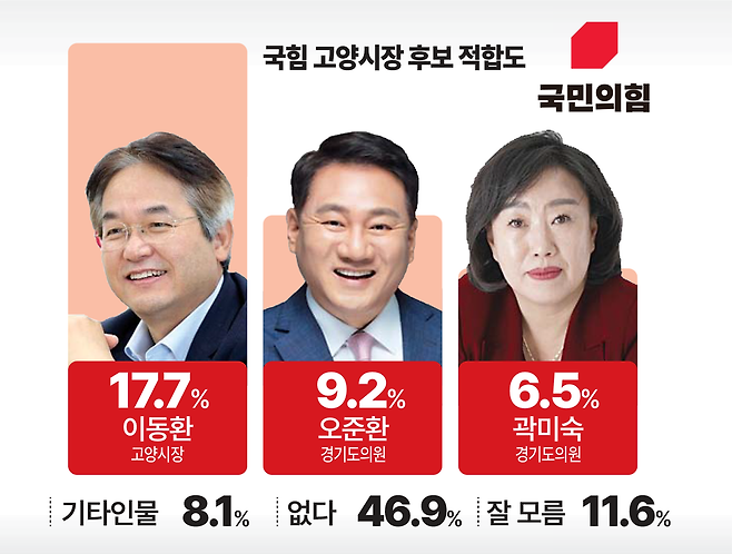 3일 중부일보 의뢰로 여론조사기관 ㈜데일리리서치가 고양시 거주 만 18세 이상 남녀 500명을 대상으로 지난 1일부터 2일까지 이틀간 실시한 여론조사 결과(95% 신뢰수준에 오차범위 ±4.4%p)에 따르면 국민의힘 소속 고양특례시장 후보로 누가 가장 적합한가에 대한 물음에 이동환 시장 17.7%, 오준환 의원 9.2%, 곽미숙 현 경기도의원 6.5%로 집계됐다.