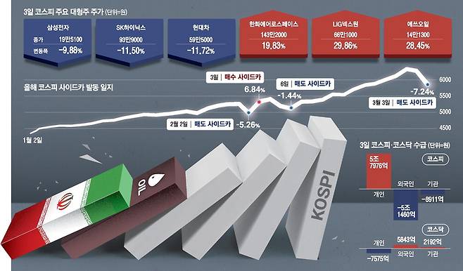 미국·이스라엘과 이란 간 전쟁으로 호르무즈 해협을 둘러싼 중동 지역 군사적 긴장감이 최고조에 달하면서 3일 국내 증시가 '검은 화요일'을 맞았다. 이날 코스피는 6200선에서 5800선까지 밀리며 최근 상승폭을 반납했다. 코스피에서 5조1000억원을 순매도한 외국인 투자자 공세에 시가총액 상위 종목이 일제히 급락했다. 고유가, 고환율에 시장이 고금리 가능성까지 점치면서 투자심리가 급격히 냉각되는 모습을 보였다.