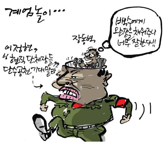 [최경락 만평] 계엄놀이… 최경락 2026. 3. 3. 20:45 음성으로 듣기 음성재생 설정 이동 통신망에서 음성 재생 시 데이터 요금이 발생할 수 있습니다. 글자 수 10,000자 초과 시 일부만 음성으로 제공합니다. 남성 여성 느림 보통 빠름 음성 재생하기 닫기 음성 재생 중지 번역 설정 번역beta Translated by kaka i 한국어 - English 영어 日本語 일본어 简体中文 중국어 Nederlands 네델란드어 Deutsch 독일어 Русский 러시아어 Malaysia 말레이시아어 বাঙ্গোল ভাষা 벵골어 tiếng Việt 베트남어 Español 스페인어 اللغة العربية 아랍어 Italiano 이탈리아어 bahasa Indonesia 인도네시아어 ภาษาไทย 태국어 Türkçe 튀르키에어 Português 포르투갈어 Français 프랑스어 हिन्दी 힌디어 닫기 번역중 Now in translation 글씨크기 조절하기 글자크기 설정 파란원을 좌우로 움직이시면 글자크기가 변경 됩니다. 가 매우 작은 폰트 작은 폰트 보통 폰트 큰 폰트 매우 큰 폰트 가 이 글자크기로 변경됩니다. (예시) 가장 빠른 뉴스가 있고 다양한 정보, 쌍방향 소통이 숨쉬는 다음뉴스를 만나보세요. 다음뉴스는 국내외 주요이슈와 실시간 속보, 문화생활 및 다양한 분야의 뉴스를 입체적으로 전달하고 있습니다. 닫기 인쇄하기 Copyright © 저작권자 © 중부일보 - 무단전재 및 재배포 금지