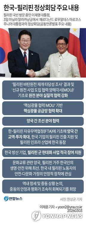 (서울=연합뉴스) 이재윤 기자 = 필리핀을 국빈 방문 중인 이재명 대통령은 3일(현지시간) 양국이 신규원전 사업 및 핵심광물 공급망 관련한 협력을 확대하기로 뜻을 모았다고 밝혔다.