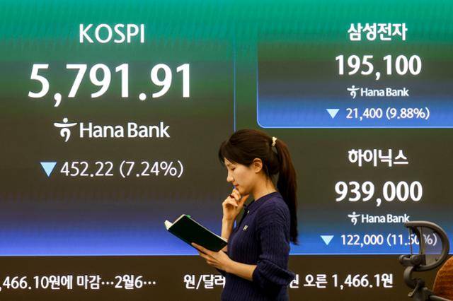 미국·이란 전쟁으로 국내 증시가 동반 급락한 3일 서울 중구 하나은행 딜링룸 현황판에 코스피지수 등이 표시돼 있다. 이날 코스피는 전 거래일 대비 452.22포인트(7.24%) 하락한 5,791.91에 거래를 마쳤다. 코스닥은 55.08포인트(4.62%) 내린 1,137.70을 기록했으며, 원·달러 환율도 26.4원 오른 1,466.1원에 마감했다. 연합뉴스