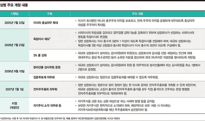 2026년 정기주주총회는 개정 상법의 변화에 대비해 정관 및 이사회 구조를 선제적으로 재편하는 중요한 해다. 지난해 공표된 상법 개정안의 주요 내용인 집중투표제 의무화, 감사위원 분리선출 확대와 3% 룰 강화 등은 조항별 이행 시점이 올해 3월 정기주총 이후로 설정되어 있다. 이에 따라 2026년 정기주주총회는 기업들이 법적 정합성을 맞추려는 선제 정비와 규제 적용 전의 방어적 기제 작용이 혼재하는 시즌이다.