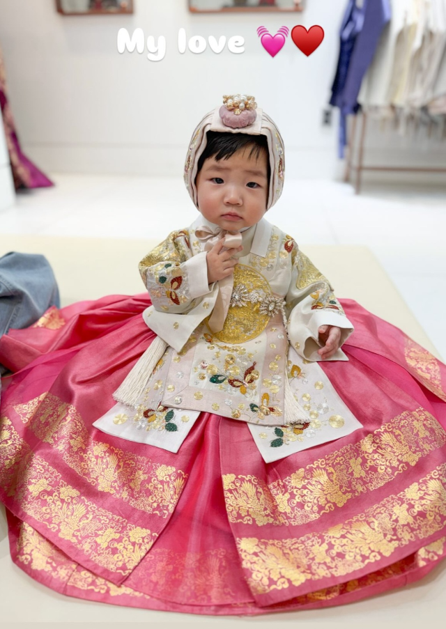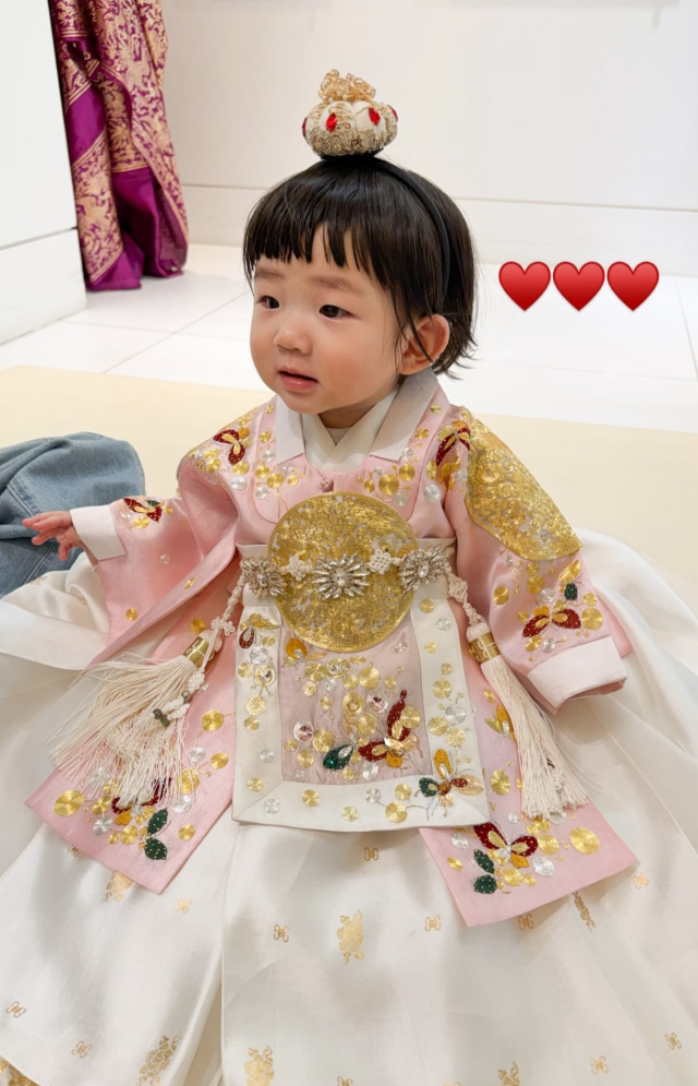 공개된 사진 속 해이 양은 금박 자수가 화려하게 수놓인 한복을 입고 앙증맞은 포즈를 취하고 있다. 핑크, 아이보리, 노란색 등 다양한 색감의 한복을 차례로 피팅하며 돌잔치를 앞둔 설렘을 드러냈다. 특히 머리 위에 올린 금빛 전통 장식은 작은 왕관을 연상케 하며 ‘공주님’ 비주얼을 완성했다.