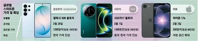 다만 삼성전자와 샤오미 모두 한국과 중국 시장에서는 가격을 인상했다. 갤럭시 S26의 경우 울트라 모델 가격이 10만원가량 올랐으며 샤오미도 17 울트라 가격을 한국에서 20만원 인상했다. 이는 원화 가치가 크게 하락한 데 따른 것이다.