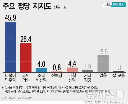 [그래픽] 정당 지지도, 민주 45.9%·국힘 26.4%