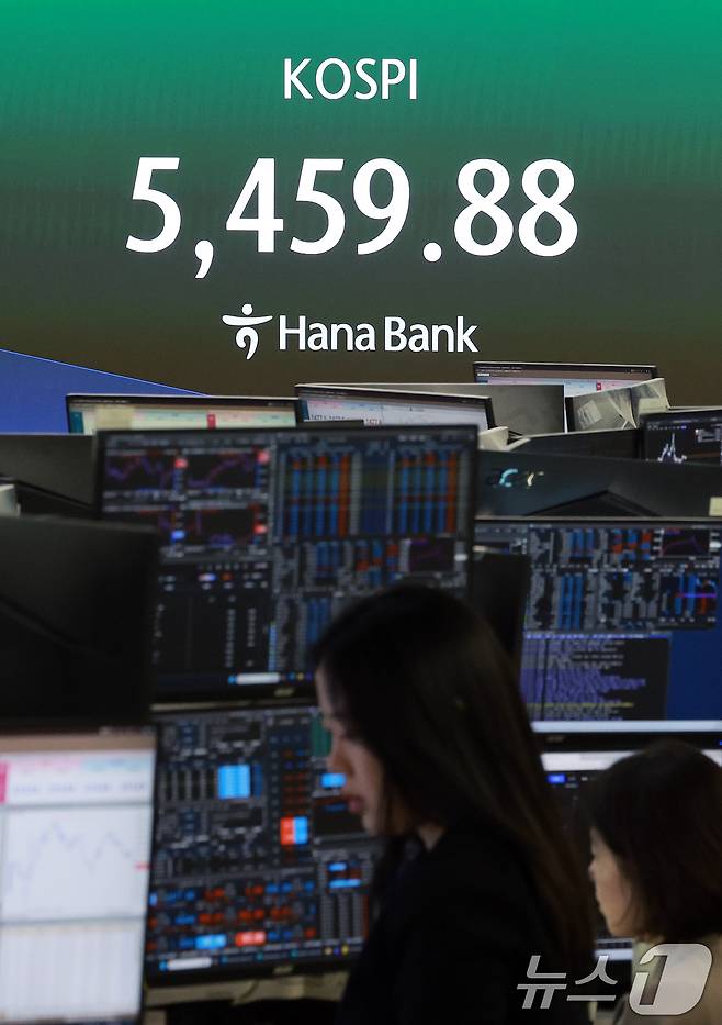 (서울=뉴스1) 이호윤 기자 = 미국과 이란 간의 무력 충돌로 경제시장 불안감이 지속되고 있는 4일 서울 중구 하나은행 본점 딜링룸 전광판에 코스피 지수가 나오고 있다. 이날 코스피는 전 거래일보다 238.98포인트(4.13%) 하락한 5552.93, 코스닥은 전 거래일보다 32.87포인트(2.89%) 하락한 1104.83에 거래를 시작했다. 원·달러 환율은 12.00원 오른 1478.10원에 거래되고 있다. 2026.3.4/뉴스1