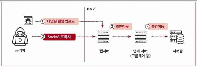 - 2단계(거점 확보): 장악한 서버와 연결된 서버를 통해 외부와 차단된 업무망 서버로 연결 통로(터널링)를 구축