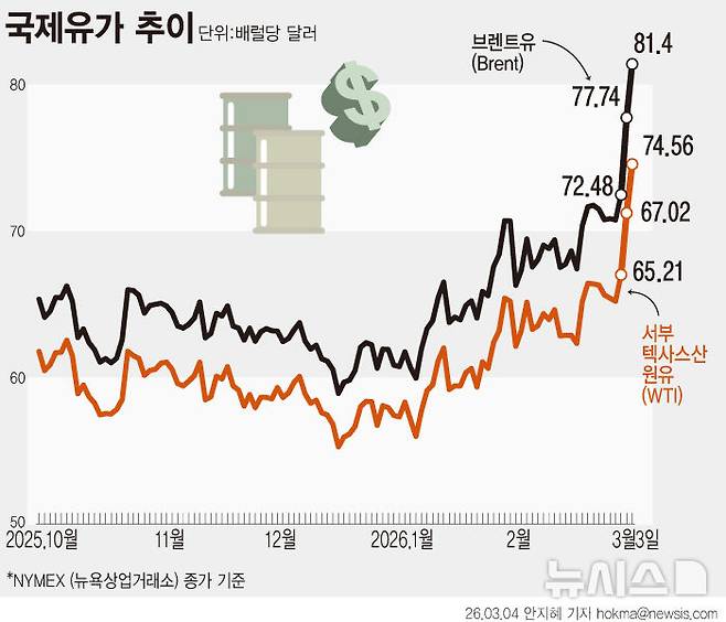 [서울=뉴시스] 도널드 트럼프 미국 대통령이 이란 분쟁으로 국제유가가 급증하자, 미 해군이 호르무즈 해협을 통과하는 유조선을 호송하는 방안을 검토 중이라고 밝혔다. 3일(현지시간 ) 국제 유가는 장중 한때 9% 넘게 치솟았다가 상승폭을 줄이며 마감했다. (그래픽=안지혜 기자)